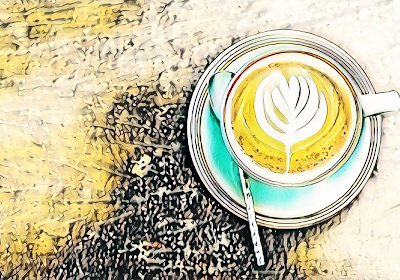 Graphic illustration of a cup of coffee with a flower drawn in it viewed from above done in yellow, black, cyan and white. Other descriptive terms include caffeine, cappuccino, espresso, brew, decaf, java, mocha, cafe, Joe, colorful, multicolored.